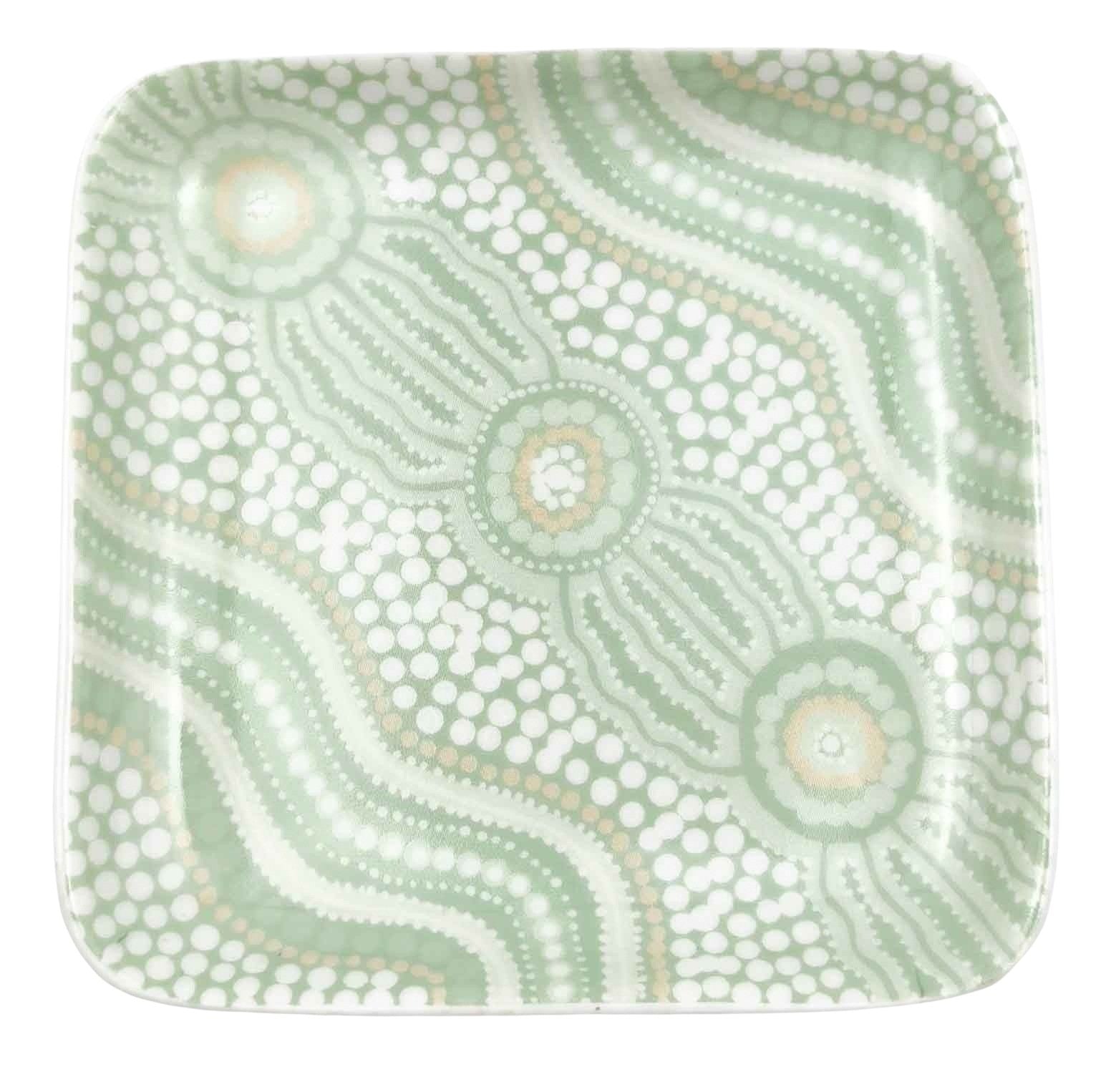 Small square shaped dish with a green Aboriginal design. Artwork done by Indigenous artist Emma Stenhouse.