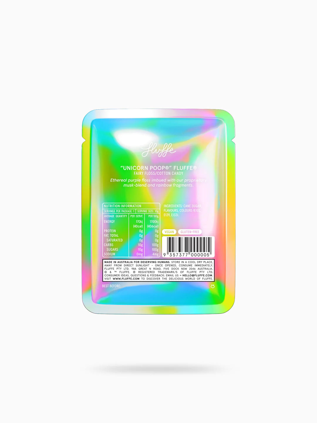 Ethereal purple floss imbued with our proprietary musk-blend and rainbow fragments, wrapped in a dazzling iridescent pack.