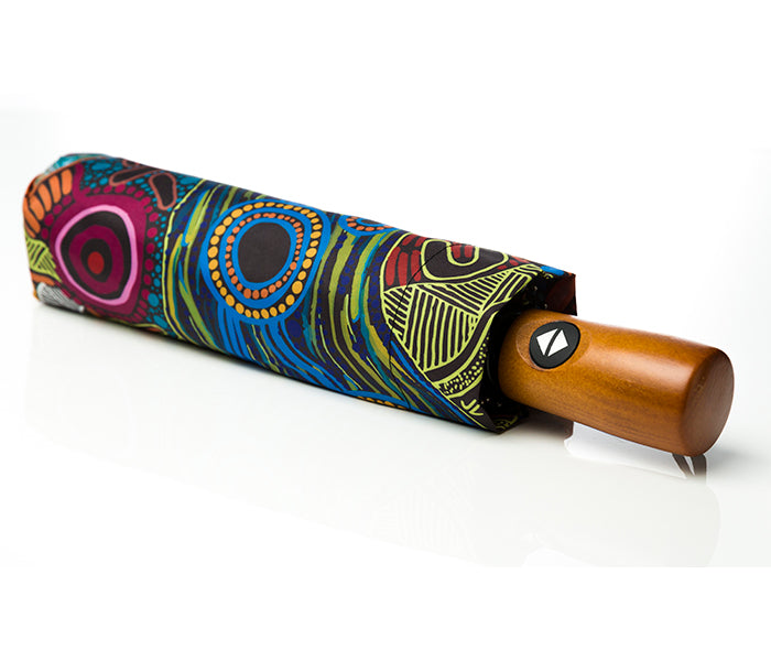 Brighten up even the rainiest days with your very own fold up umbrella featuring Aboriginal artwork by Justin Butler from North Queensland, Australia. These Auto Open/Close Fold up umbrellas are perfect for when you are on the move and want to bring some art into your every day! Finished with a wood finish handle and matching printed slip these fold up umbrellas are sure to please!