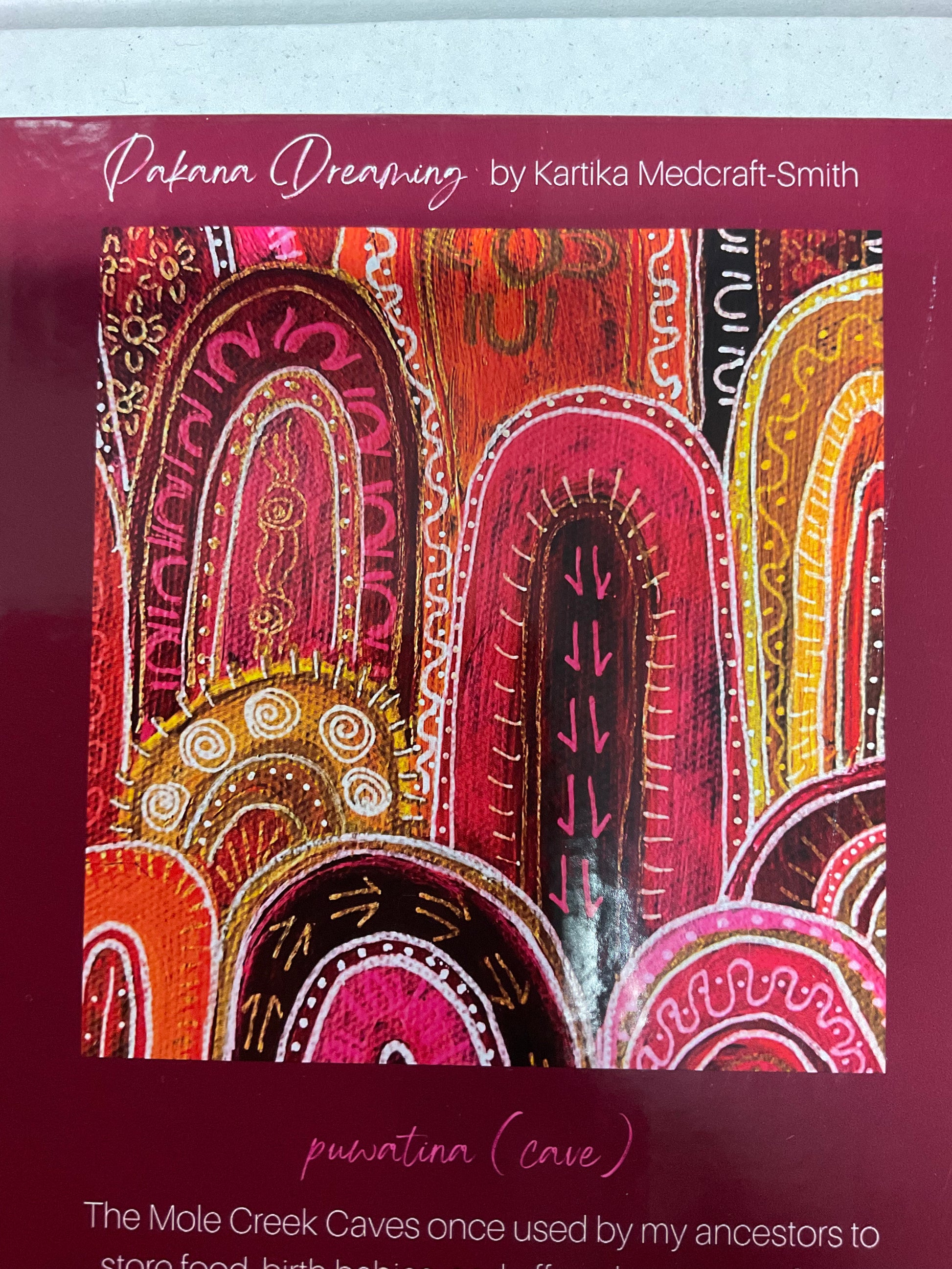 Her artwork is inspired by the Tasmanian Mole Creek Caves used by her ancestors for birthing, storing food, shelter and creating tools and teaching.