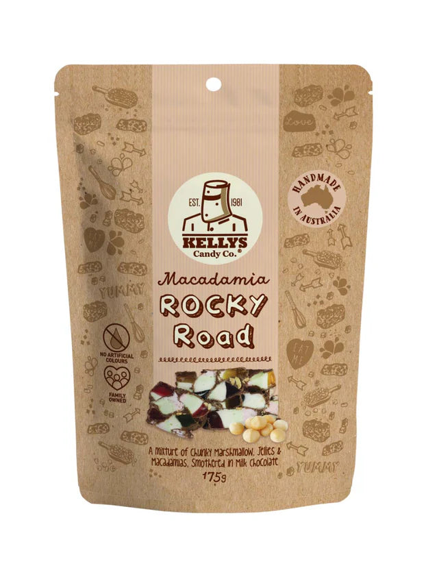Enter macadamia heaven with our sweet, chunky, delicious Macadamia Rocky Road. We make this by pouring made-in-house marshmallow onto our signature recipe jellies. Cut up the jellymallow slab into chunky pieces and mix with the best quality macadamias, finally smother in melted milk chocolate.