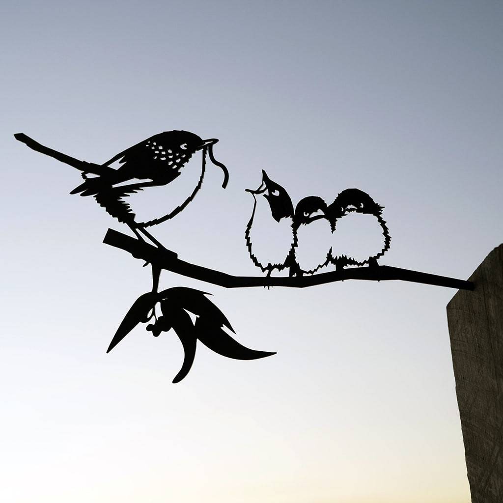 What’s cuter than a Blue Wren? Baby Blue Wrens! And these three are hungry to nest in your garden. Mother Blue Wrens sing a complex song to their eggs to both train and protect her babies, so they will become strong and survive to adulthood. This song that she sings, teaches them how to beg for food after hatching. Here, these chicks are begging for a worm from their mother the way that she taught them. We think they are too cute! Enjoy these cuties all year round, another one of our Australian made garden ornaments.