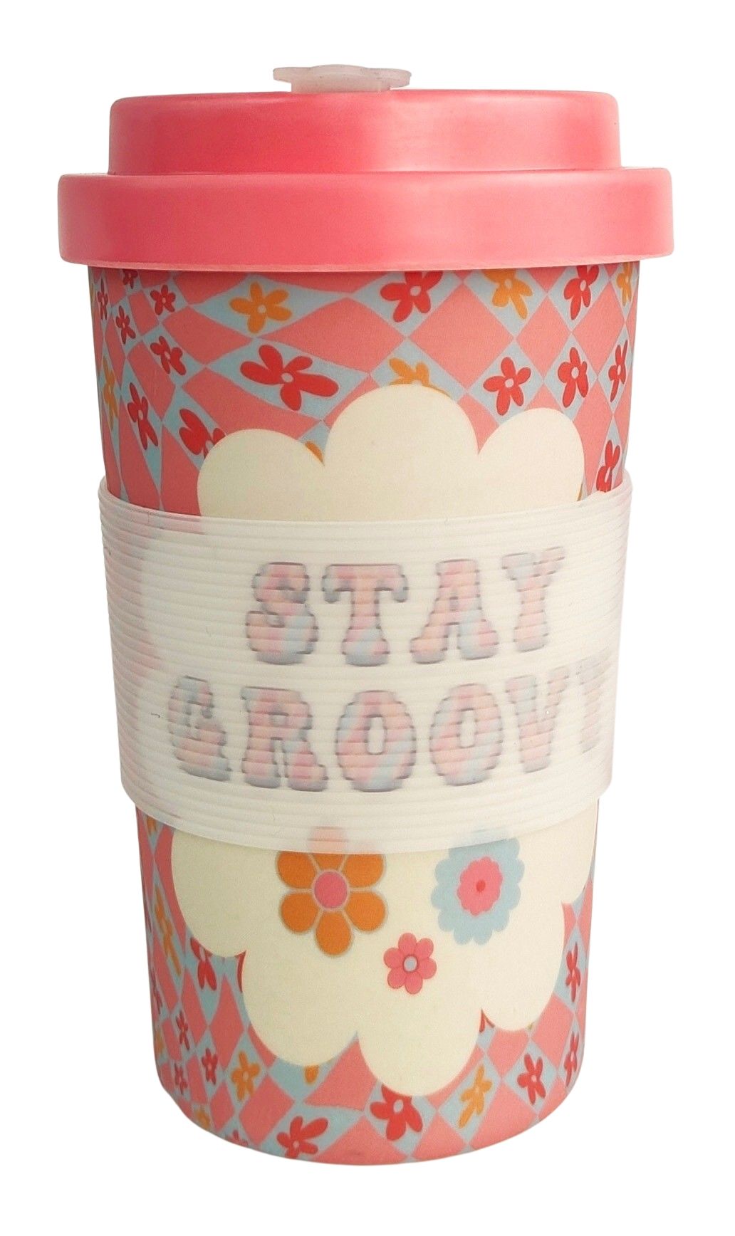 Sturdy travel mug with a retro floral design with "Stay Groovy" on the front.