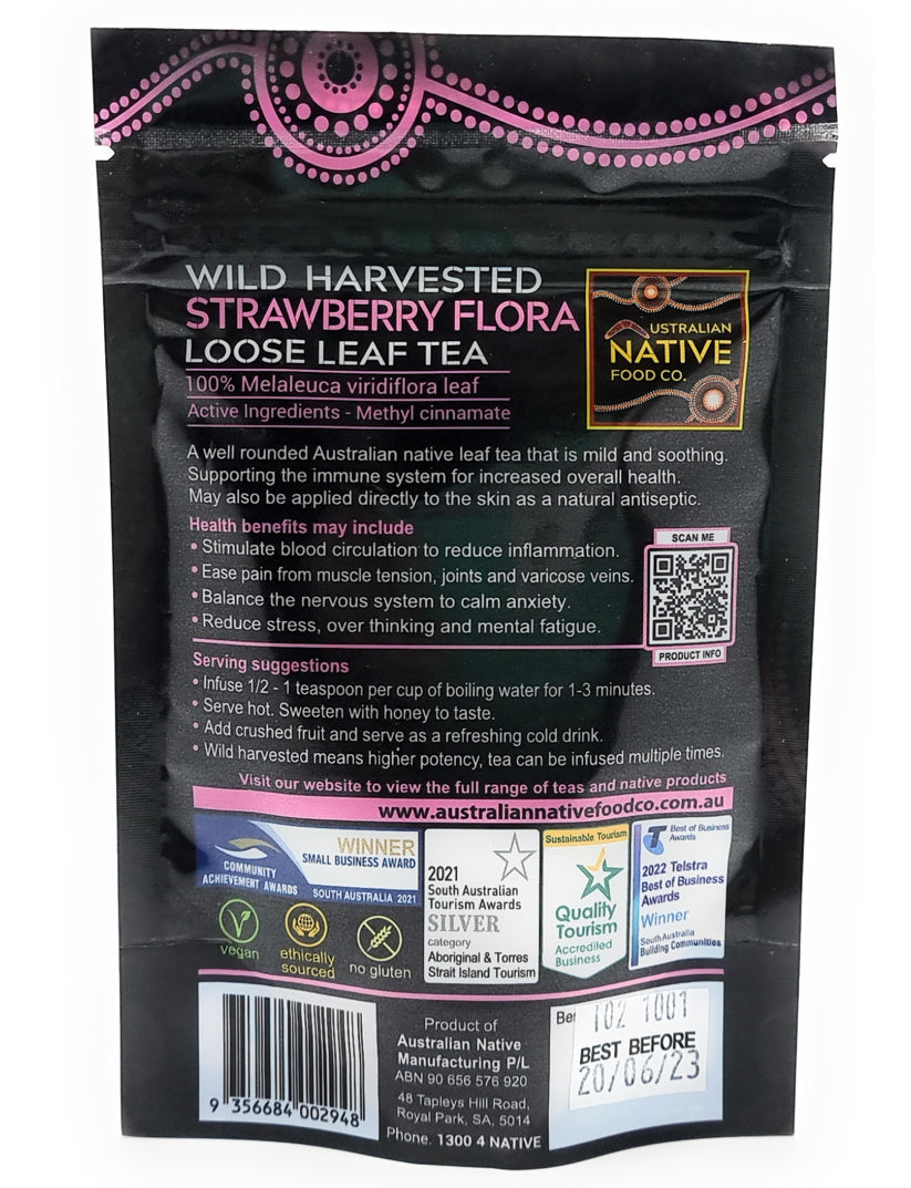 Strawberry Flora is a well-rounded Australian native leaf tea that is mild and soothing. Supporting the immune system for increased overall health. May also be applied directly to the skin as a natural antiseptic.