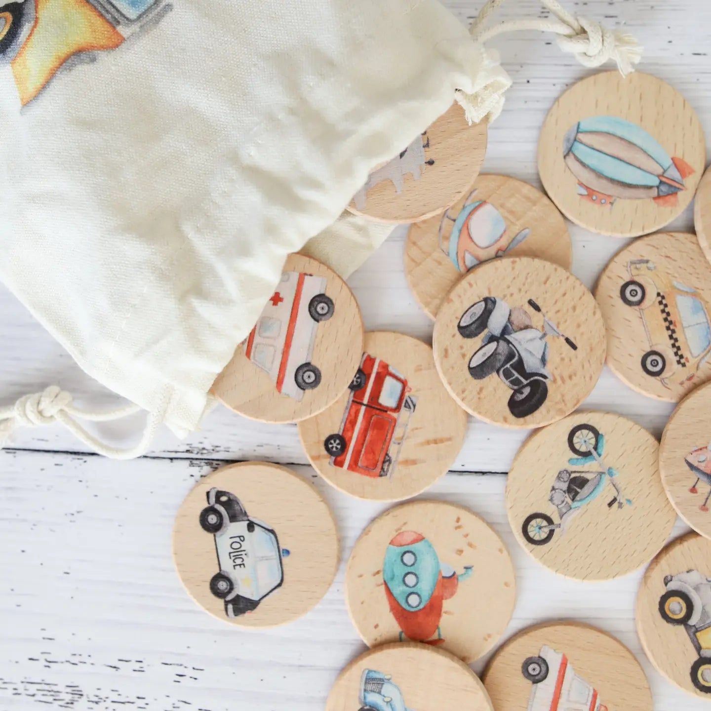 This transport theme memory match game is incredibly versatile, perfect as a memory game, for open ended play or as an educational resource. Designed and made in Australia this 28 piece set has 14 different transport themed prints and comes in a printed calico bag for storage. The perfect little travel game for a picnic, visit to grandmas or holiday, each disc is 3mm thick and 50mm in diameter. Memory matching games are great for improving your child's concentration, focus, memory growth, and fine motor skills, all while providing hours of fun and entertainment. Your child will love matching all of the transport images, at the same time encouraging them to create their own stories and games with this hands on, educational game!