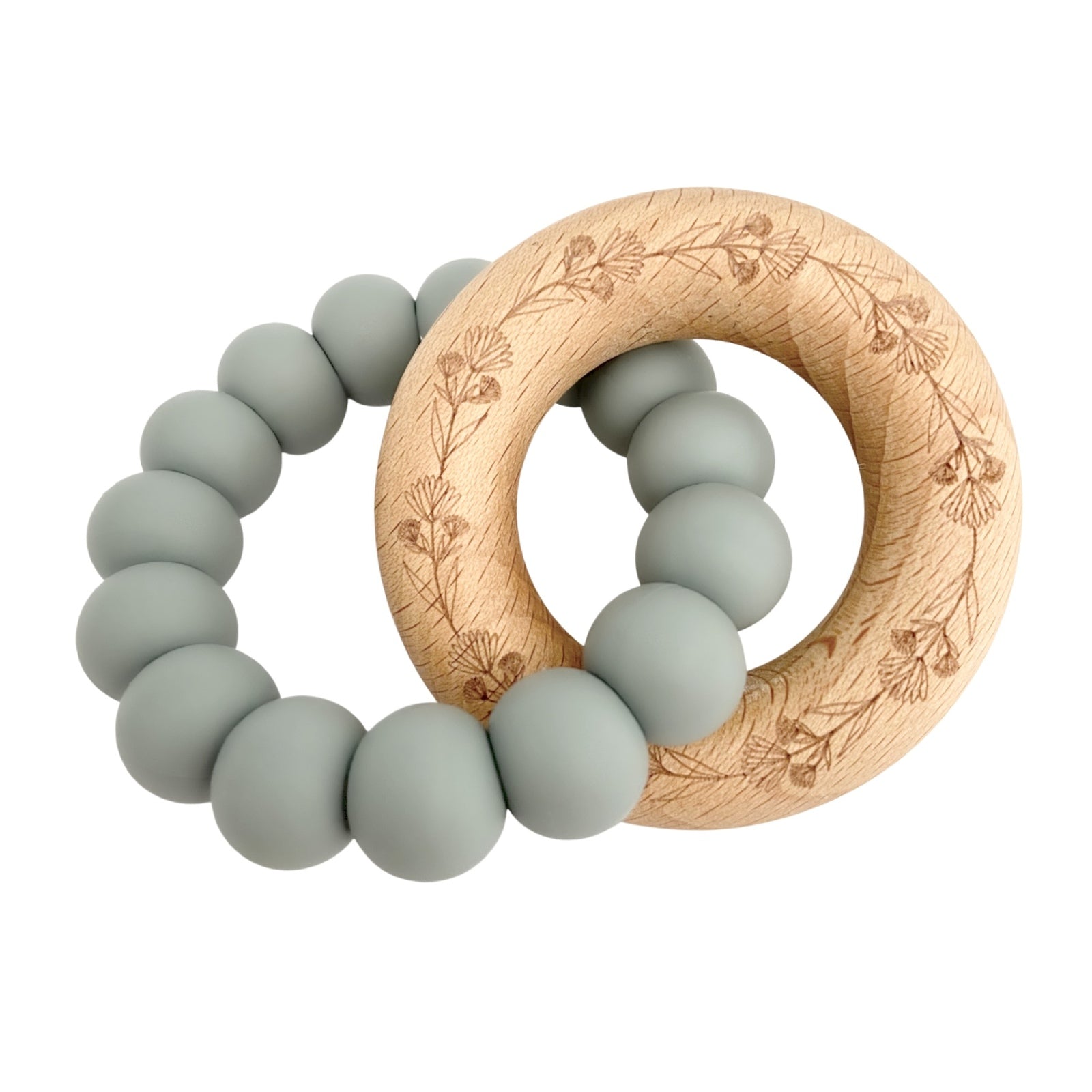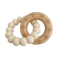 Our WILDFLOWER teether is made from a beaded silicone loop that's interlocked with a whimsically engraved beech wood teething ring. Easy for your baby to hold and chew on!